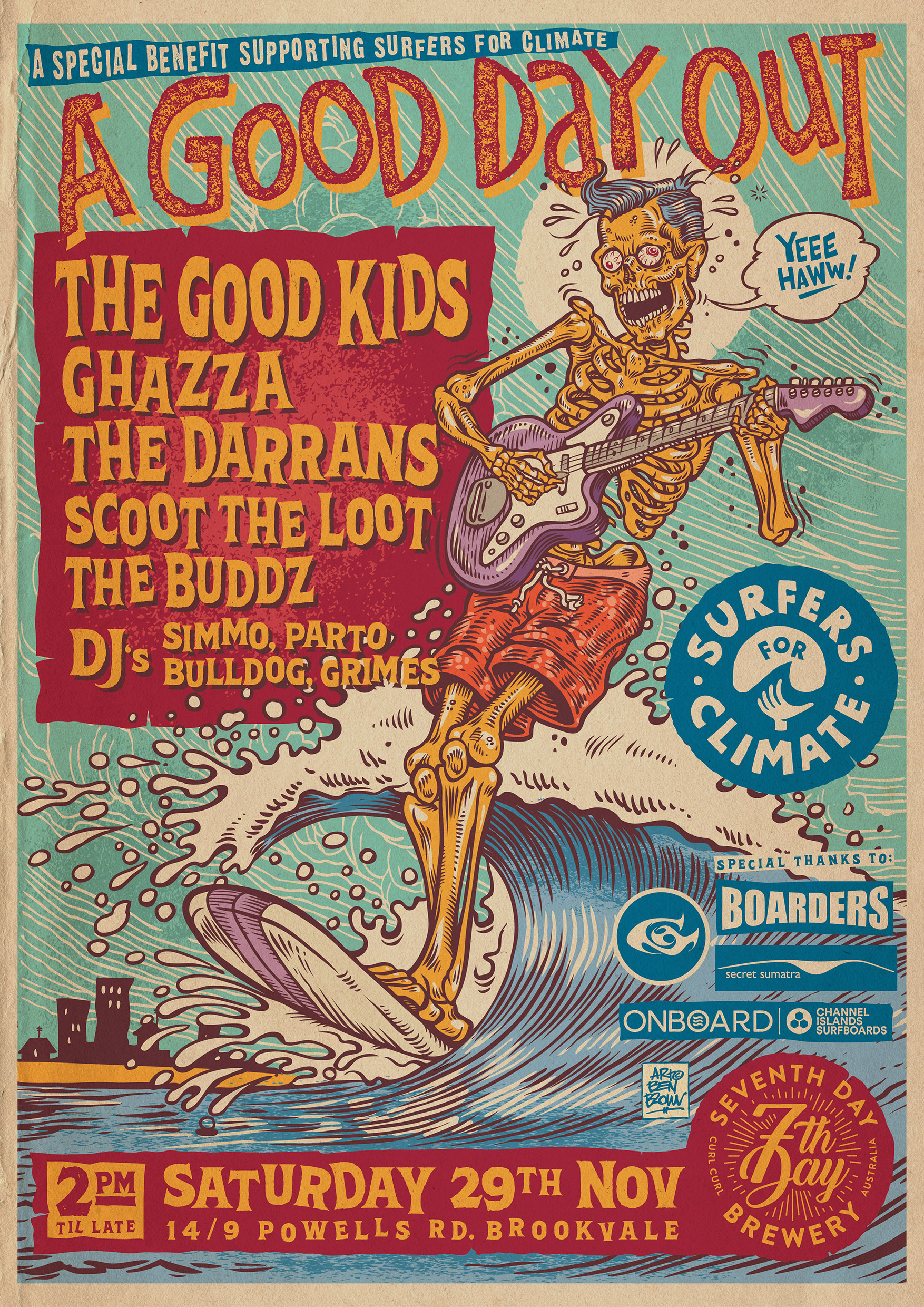 From midday till late, 7th Day’s HQ and carpark surrounds will become a multi-sensory playground of huge local Beaches’ bands, extravagant collabs, huge energy and feel-good vibes – with a mission to raise $20,000 for environment lords Surfers for Climate.
