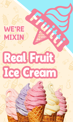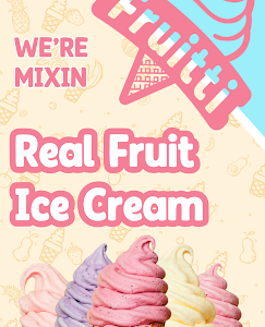 Fruitti is real fruit, hand-mixed fresh in a Fruitti Mixer with a creamy base of your choice: Frozen Yoghurt, Vanilla Ice Cream, Coconut Ice Cream, or Ice for a Fruitti Sorbet. No artificial ingredients, no syrups, just real fruit, blended to perfection.