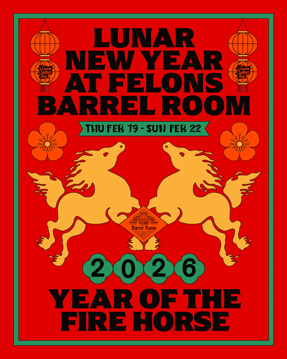 Felons Barrel Room will celebrate Lunar New Year with a four-day program of food, tradition and community on Manly Wharf, welcoming the Year of the Fire Horse from Thursday 19 February to Sunday 22 February.