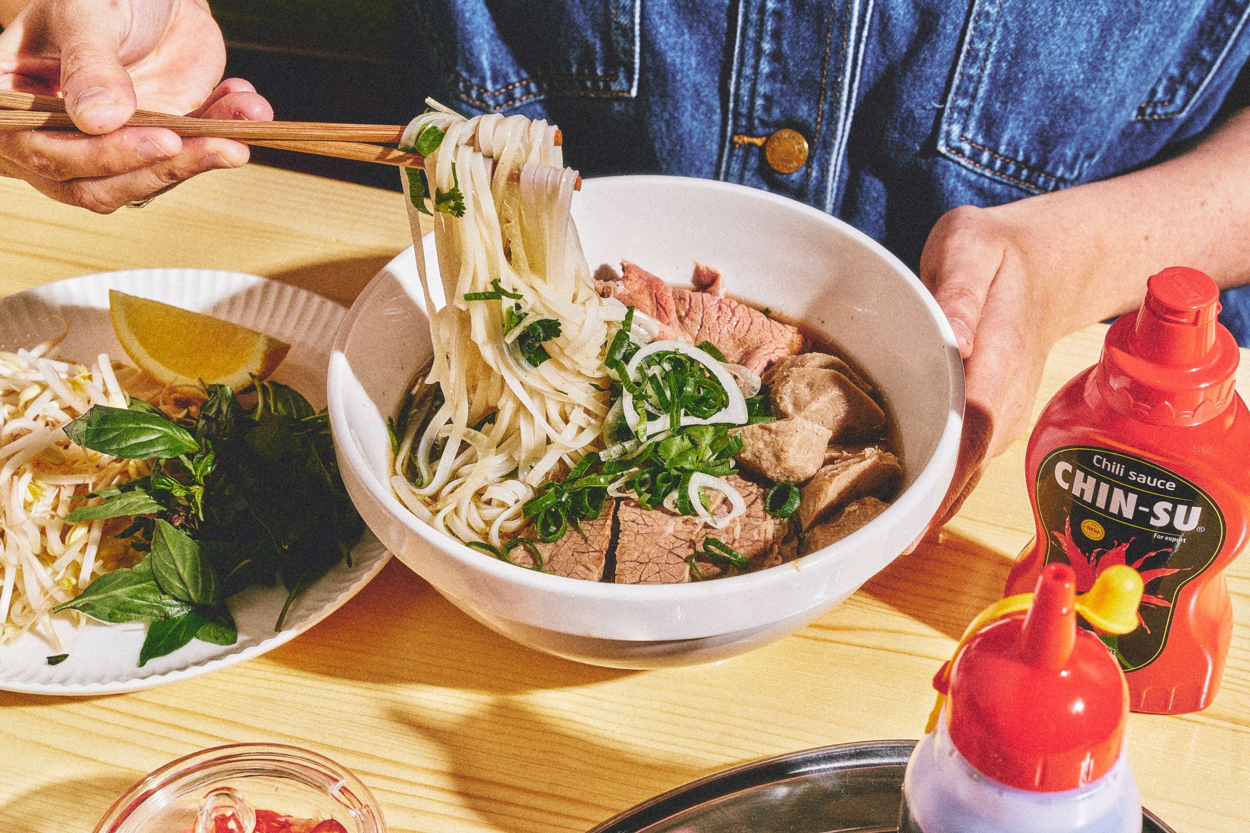 The menu also features Phở Ho Chi Minh, with its signature slightly sweeter, richer broth. The Đặc biệt comes with rare sliced beef, brisket and beef meatballs, while lighter options include noodles with broth or a simple bowl of the broth on its own.